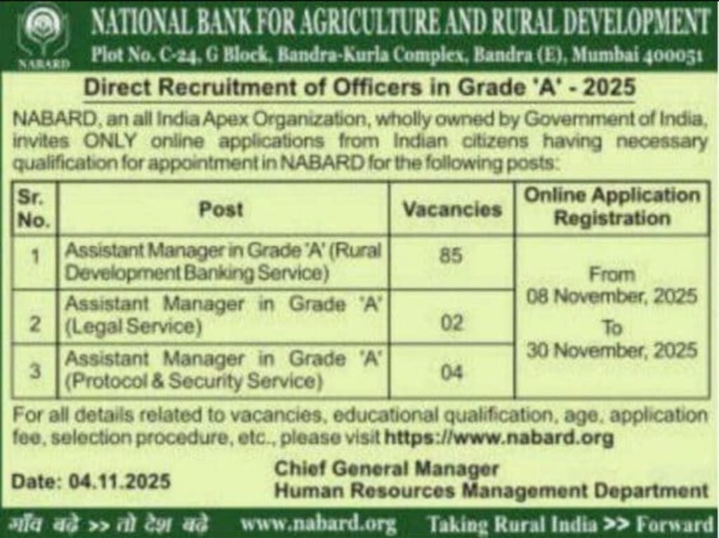 NABARD Recruitment in Hindi : राष्ट्रीय कृषि एवं ग्रामीण विकास बैंक (NABARD) ने कई पदों पर भर्ती के लिए आवेदन निकाले हैं। वे उम्मीदवार जो सहायक प्रबंधक ग्रेड ‘ए’ के विभिन्न पदों पर नौकरी पाना चाहते हैं, वे आज ही आधिकारिक वेबसाइट या आगे दी गई लिंक के जरिए ऑनलाइन आवेदन कर सकते हैं। अधिक जानकारी के लिए इस खबर को पूरा पढें…