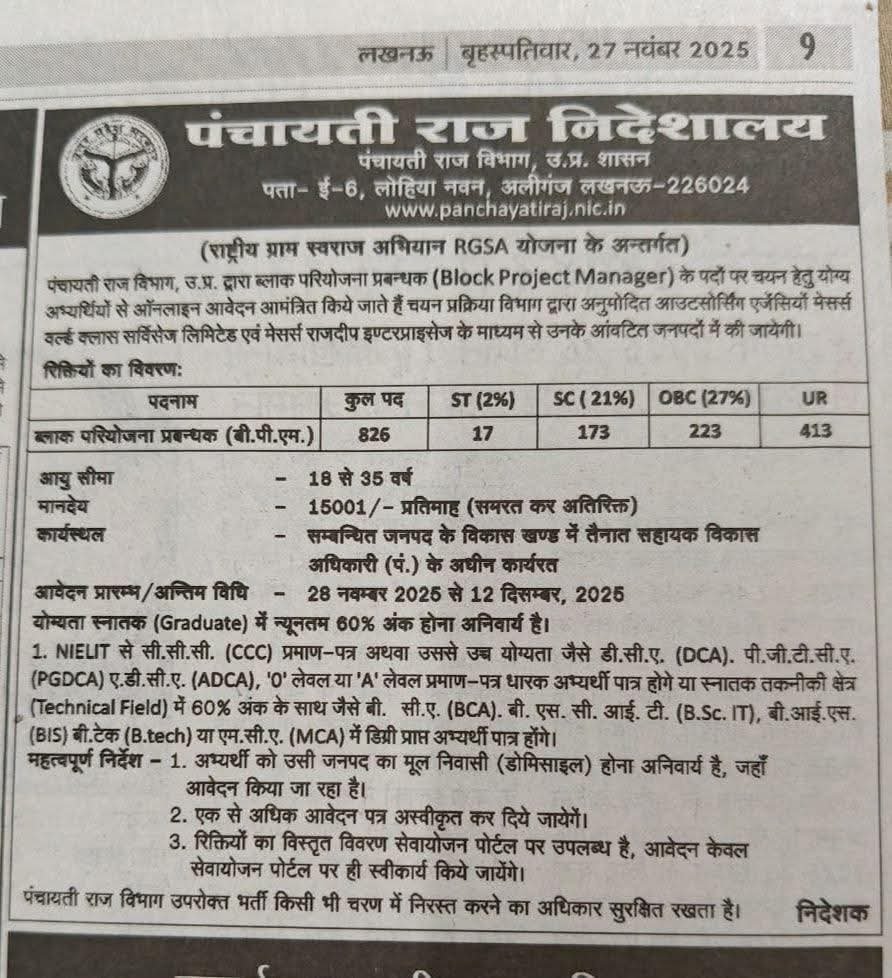 UP Panchayati Raj BPM Recruitment: उत्‍तर प्रदेश सरकार द्वारा युवाओं के लिए बंपर भर्त‍ी निकाली गई है, जिसके तहत यूपी पंचायती राज विभाग ने ब्लॉक परियोजना प्रबंधक (BPM) के पदों पर भर्ती की जा रही हैं। इच्‍छुक व योग्‍य उम्‍मीदवार 1 दिसंबर, 2025 से आवेदन कर सकते हैं। इस भर्ती के लिए युवाओं को स्‍नातक होना आवश्‍यक है। अधि‍क जानकारी के लिए उम्‍मीदवार आगे दी गई अधि‍सुचना को देखें।